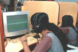 Each booth has a Computer Monitor that shows the wave pattern of the student’s speech on screen along with a pre-recorded or online teacher’s speech wave pattern. Students can then keep on practicing until he/she improves to bring his/her speech wave pattern nearest to the wave pattern of the teacher. The teacher can hear student’s voice by selecting the particular student’s microphone and the teacher can ask the student to watch and improve his/her lip version by seeing the lip version of the teacher on the class – room TV screen. Students also have the facility of calling the teachers attention by pressing the call button on his/her booth. The student’s booth also has headphones with volume control for listening to their respective sound levels.