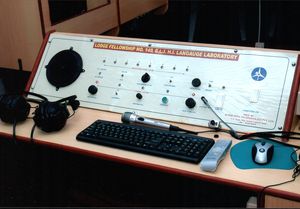 Each Student booth has an Audio spectrum-viewing device on which he/she can view the Audio spectrum of the teacher and his/her own voice simultaneously for comparing the stress points. The student can record a 12 second speech on his/her device fixed in the booth and can view and listen repeatedly for improving his/her own speech by an on line feed back. The 12 second recorder also serves the purpose of fast and perfect speech and word cramming.